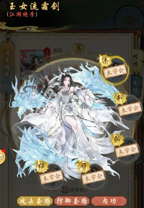 2、玉女流霜剑:其攻击速度迅猛,可于短暂时间内对敌方发动多次攻击,在前期用来快速清除小怪颇为合适,借此能够获取经验与掉落物品。