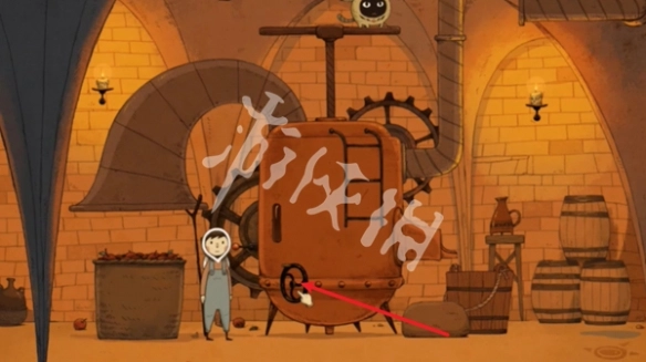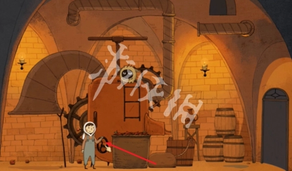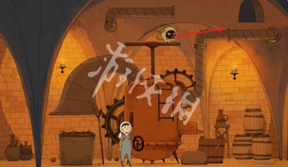 6、引导小女孩转动转盘来切换管道,使小怪兽能够跳到右侧的管道上,随后进入洞中。