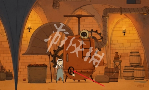1. 促使小怪兽跳到右侧的石头上,小女孩将左边的苹果篮子推过来。