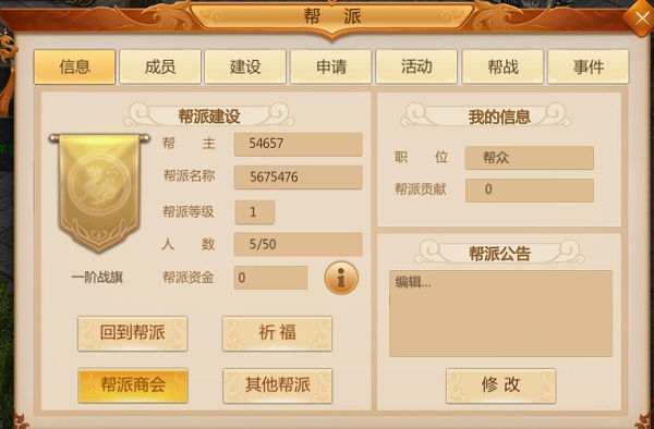 玩家可以在帮派界面查看一些基本信息,界面如下: