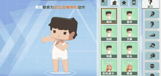 在动作应用界面,能够对人物在游戏里的动作进行编辑。在界面的最右侧,可看到8种基础动作类型,分别为站立、跑、坐下等等。