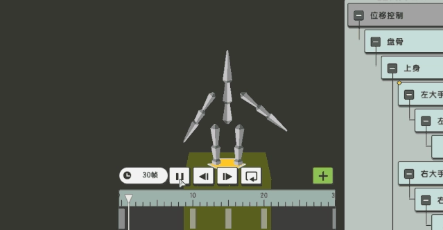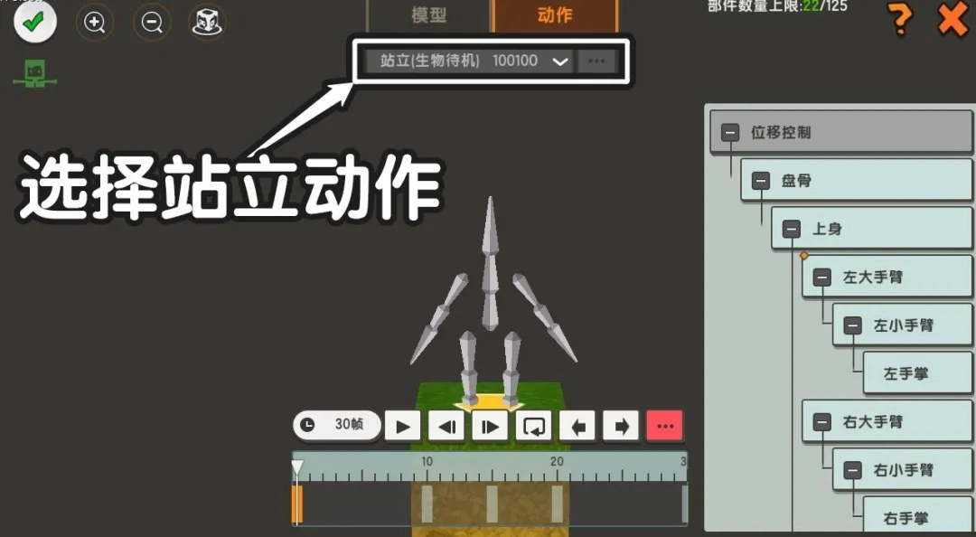 点击页面上方选择站立动作,其动作制作方法与自定义模型一致,都是通过调整部件位置并插入关键帧来完成动作制作。在此,我们简单制作一个挥手动作: