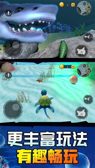 2、海底鲨鱼大猎杀是开放世界养成游戏,采用趣味的大鱼吃小鱼玩法,海底场景十分的逼真还原写实!