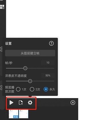 第三步:打开后画布下方会出现一排新的窗口,上面的三个图标依次为播放、添加帧数和设置,在设置里面能够对秒数和洋葱皮的不透明度进行设置,等我们一帧一帧制作完动画后,就需要调试秒数和预览播放次数,如图所示: