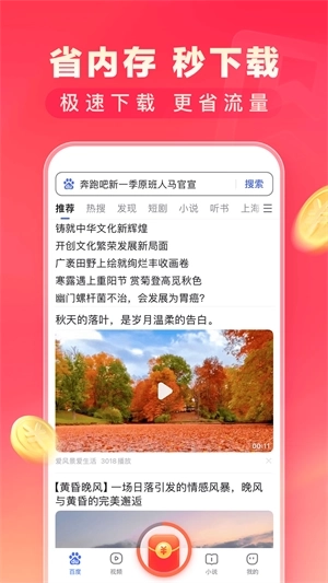 百度极速版是一款可以领现金的浏览器。软件安装包小,占内存少,适合小容量手机或硬件配置较低的机型,能流畅运行,搜索更便捷。任务系统全新上线,用户可通过邀请好友做任务、签到领金币等方式赚钱,金币自动兑换现金。有需要的用户们赶紧下载体验吧。