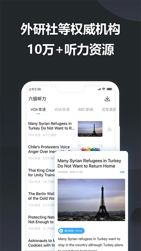 3、身份定制:四级、六级、考研、托福、雅思、职场,选择开量身定做的学习计划,听说读写专题练习。