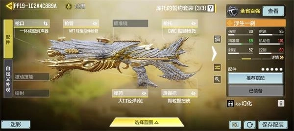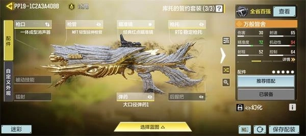 作为一把在近距离拥有极高爆发的冲锋枪,带上大口径弹药后可以做到三枪倒,并且提高射程。但是冲锋枪主要作用是近战贴脸,所以我们尽量选择扩容弹匣,这样可以提高我们的容错率,所以我的配装如下。
