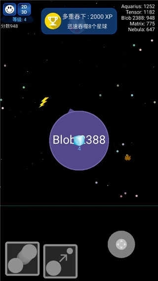2、开启游戏:游戏开始后,我们便进入吃球环节,只能吃掉比自身小的球。游戏前期吃球成长速度较慢,此时更多地要依靠吞噬星云来实现快速增长。一旦看到亮色的星云,就得迅速冲过去抢夺!
