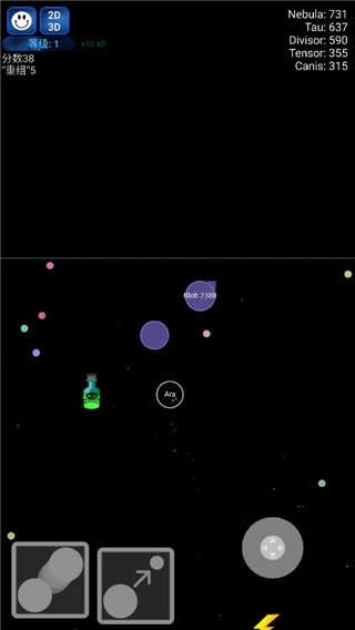 3、分身技能:当得分突破20后,便能启用技能。首个技能为分身,此技能会分出一半的分数,从而创造出另一个球。该技能一般有三个用途,一是吃掉对手,二是用于逃命,三是借助分身去吃亮色星云。