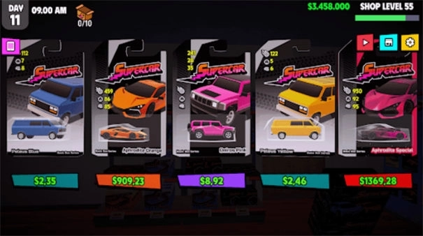 3、玩家可以设计属于自己的商店,解锁并上架销售各式各样的小汽车,而不同的系列小汽车都有其独特的优点。