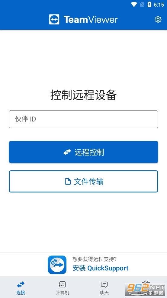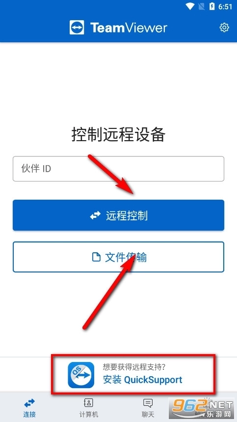 4、可以看到主界面中的“控制远程设备”之下,有远程控制和文件传输两个选择,使用TeamViewer手机远程控制手机前提则是安装Quicksupport。