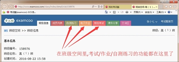 4、在打开的班级空间页面上,就可以完成电子作业/自测练习、参加班级考试了。