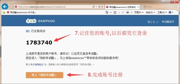 7、注册成功后会看到如下图所示的提示信息。请记住你自己的账号,以后都要凭它才能登录考试酷网站。