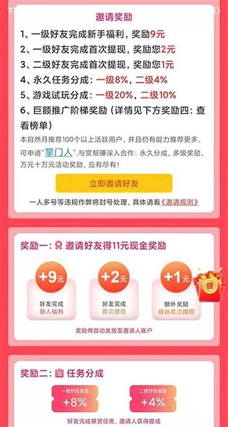 邀请好友能获取被动提成奖励。要是你把赏帮赚推荐给渴望赚钱的朋友,当他们在平台做任务赚取佣金时,你就能得到永久提成奖励。其中,一级好友提成比例为8%,二级好友为4%。除此之外,还有好友完成新手福利、首次提现等奖励。