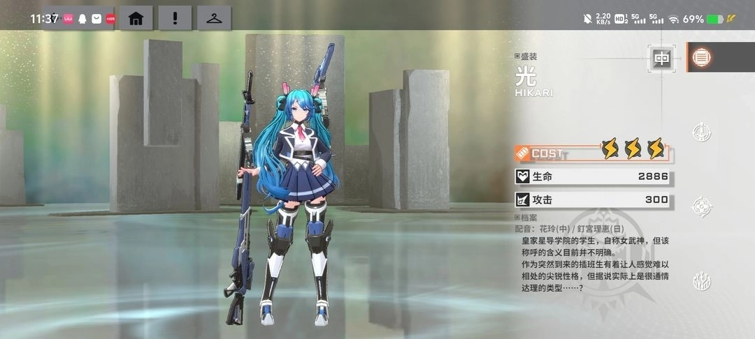 3、光(常驻30给了就用)优点:算是强度很高的角色,格斗技能等伤害都很高,不惧怕近战格斗。不好的点是,新人第一次玩可能打不中人判=定上还是设计不太行希望会改。