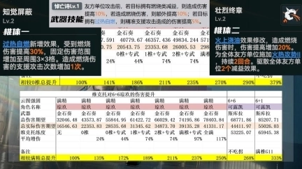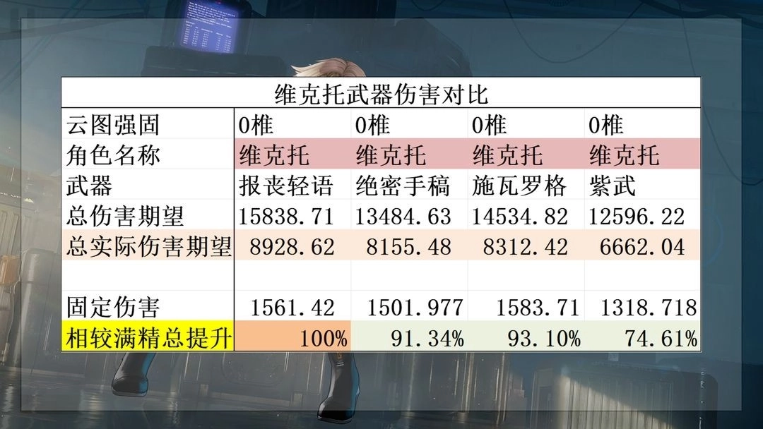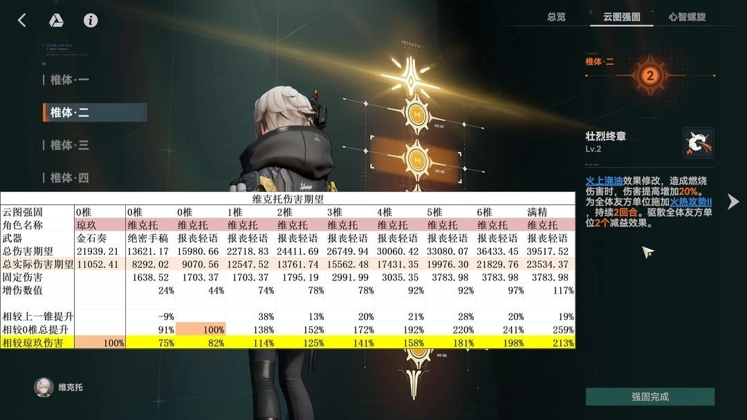 接着就是维克托的增伤能力,这里分别计算了两组数据,分别是对于0+1琼玖和6+6琼玖的提升幅度,要注意我这里计算的是总提升,而不是全部对标0椎琼玖。0椎维克托可以为全队提供平均25%的燃烧属性增伤,但是更大的提升在于提供多一次的支援次数,这个提升对维克托自己也是生效的。0椎维克托就可以为琼玖提供约35%的总伤害提升,但是更大的贡献在于属性克制的破稳能力提升。
