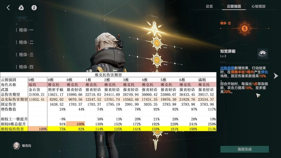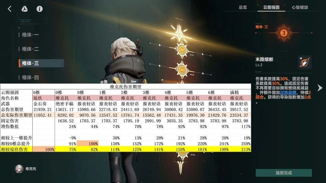 3椎:增加1技能的倍率,还有额外的【过热自燃】效果,大家可以注意到这次的伤害期望里有一行写的是固定伤害,这里是平均下来每回合的固定伤害,可以看到3椎时回合均固定伤害已经来到了近3000点,占到了输出的五分之一,非常夸张。这里也整理了一下维克托能够造成的固定伤害倍率:一技能80%+被动和一技能的两次过热自燃20%x2+地格和一技能的两次溢火结算伤害10%x2,共计140%倍率的固定伤害(1技能CD的回合会较低,这里3000算的是平均),这还没算大招給友方附加的固定伤害,我只能说,肥肠滴恐怖。