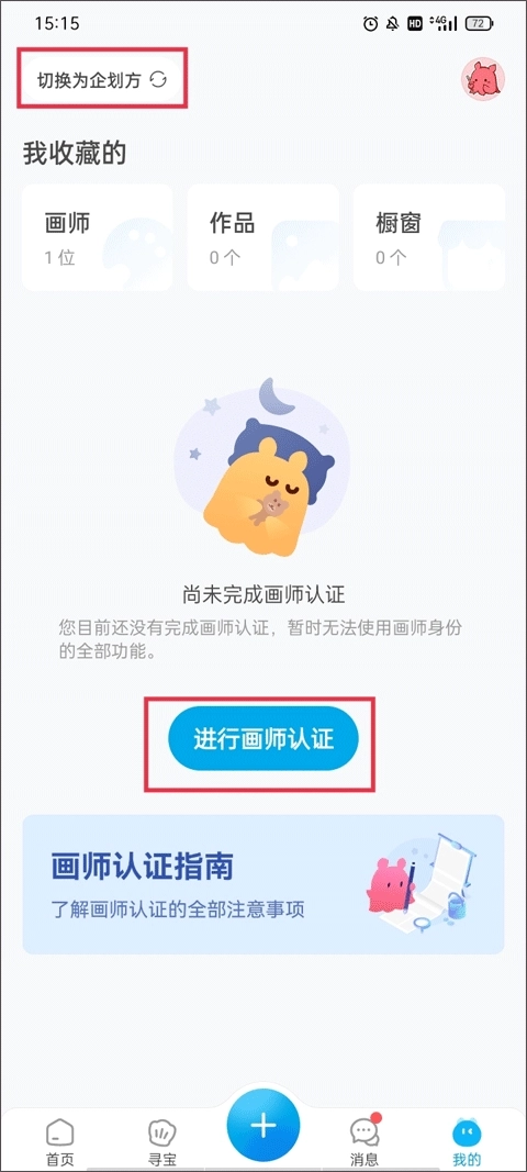 1、首选需要切换角色为画师,然后点击下方的“进行画师认证”。