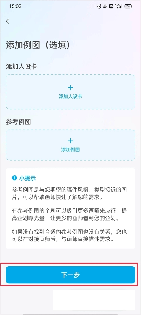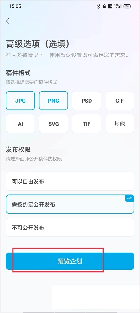 4、以发布定向企划来说,后续所有内容仅该画师能够看到。依照企划的操作流程,挑选你的约稿时间与稿酬预算,依据自身需求添加例图与人设卡。最后,选择所需的稿件格式、发布权限,点击预览企划,查看最终呈现效果即可。