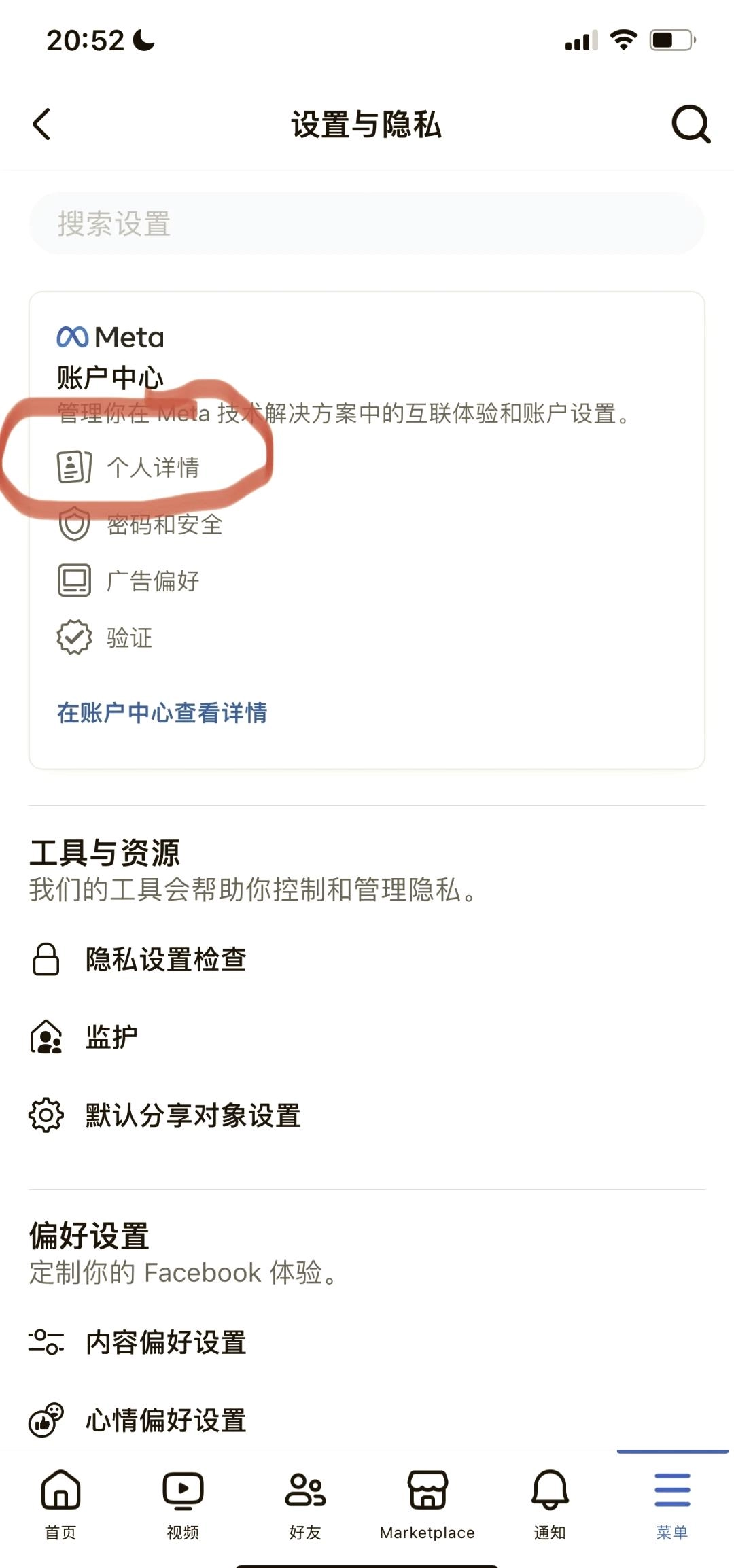 2. 于设置与隐私页面内,寻觅并点击“账户中心”,打开后再点击“个人详情”