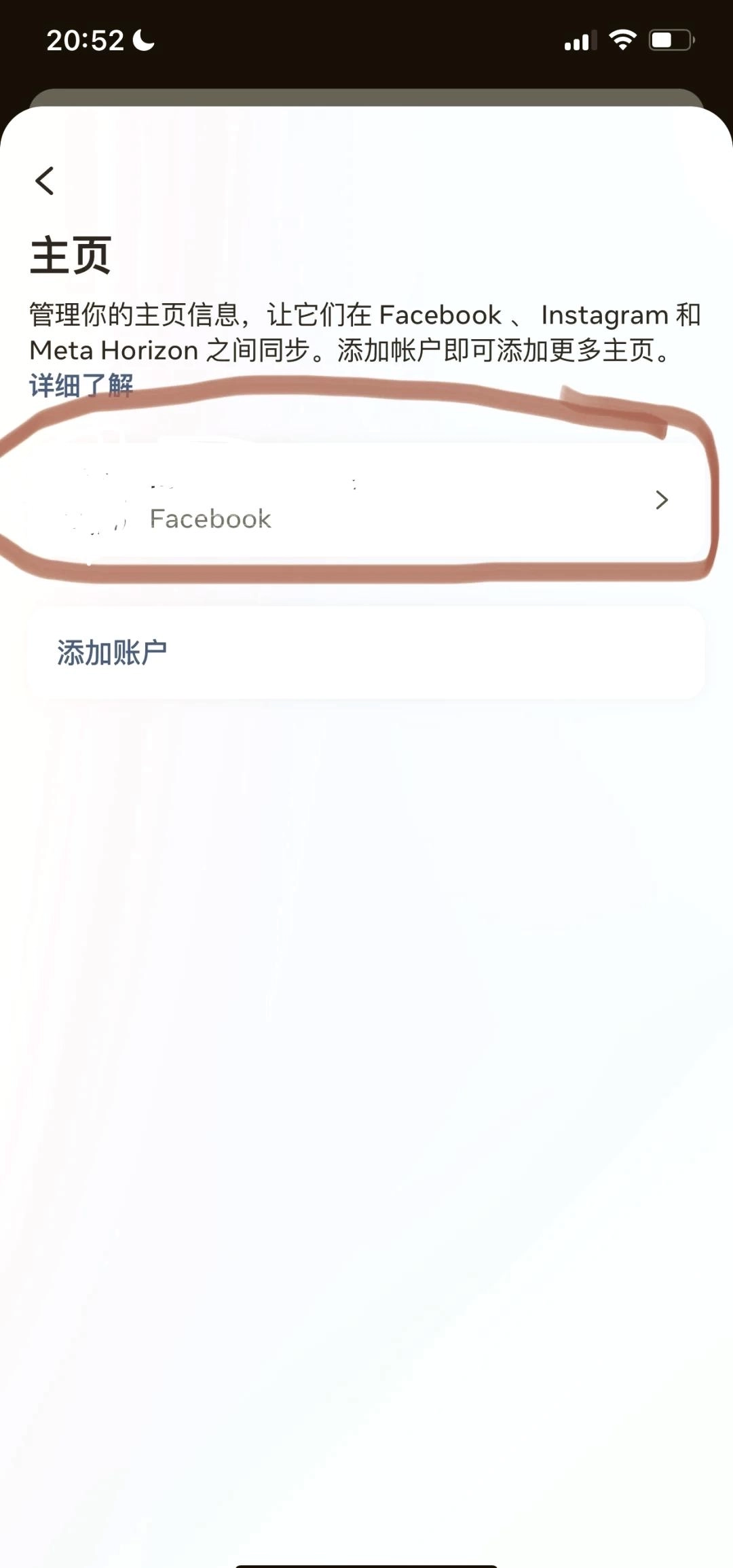 4.在主页方面,点击Facebook账户