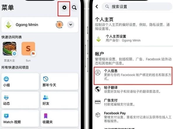1. 开启Facebook,进入到菜单界面,轻点右上角的齿轮图标,接着点击账户下方的“个人信息”选项。