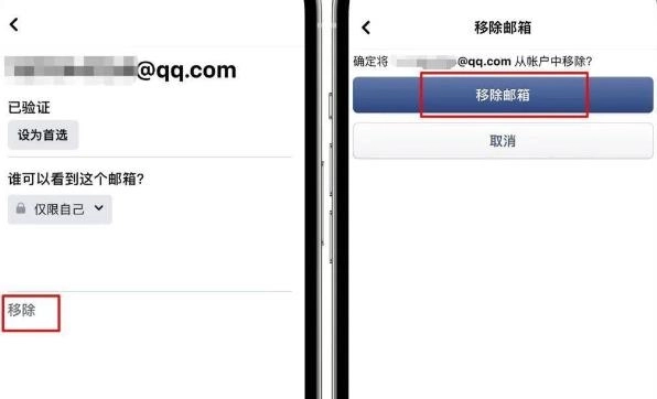 6. 若要替换原有的旧邮箱地址,在管理联系方式页面选中旧邮箱地址,点击“移除”,接着点击“移除邮箱”,如此一来,脸书的联系邮箱便完成替换。倘若只是新增一个邮箱,则无需进行移除操作。