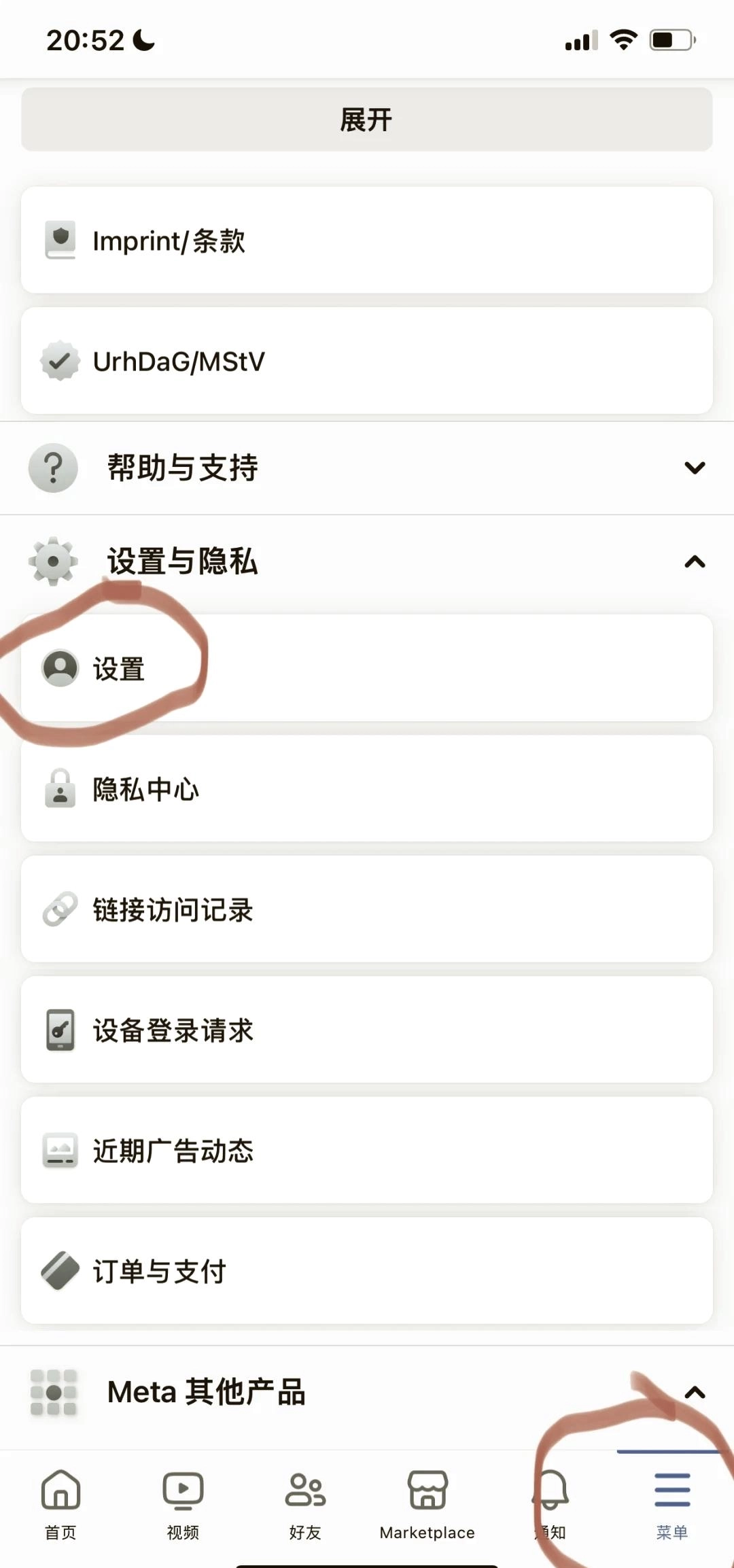 1. 进入Facebook,轻点右下角的菜单按钮,于菜单页面中点击“设置”选项