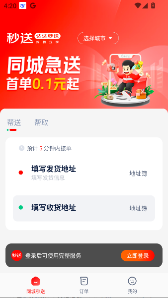 达达秒送是达达集团旗下的本地即时配送平台,致力于解决各行业企业、中小企业与个人用户的同城配送需求。更是提供全天24小时的同城帮送、帮取、帮买服务,平均1分钟下单响应,8分钟上门取件,1小时送达全城。