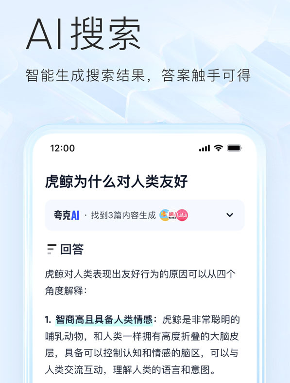 1、夸克AI搜索:可用于学习知识、解决工作与生活中的问题以及搜索资料,它能智能汇聚全网内容,生成优质回答。