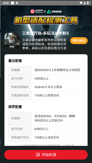 三角洲行动机型适配检测工具,是官方推出的一款应用程序,其目的在于协助玩家判断自身设备是否契合游戏公测机型适配标准。此工具给出了一个初步检测标准,然而最终的游戏体验还是要以实际游玩情况为准。