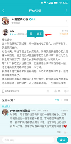 3、我们可以对评论点赞,也可以分享,虽然不能复制,但是在PC端上是可以直接复制的,手机上只能分享哦!