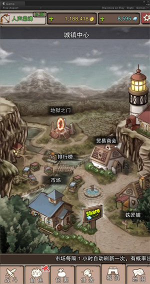 在游戏的“城镇中心”玩家可以看到“市场”、“铁匠铺”、“排行榜”、“地狱之门(目前暂未开放)”等等。