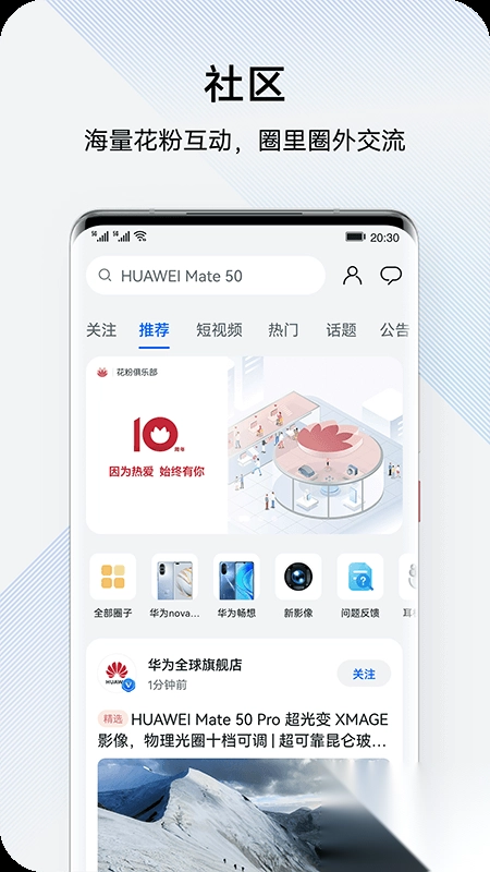 技术切磋,花粉互动。这里是华为粉丝专属的交流社区,有着各式各样丰富的圈子话题,大家可以在此分享趣事、倾诉心声。