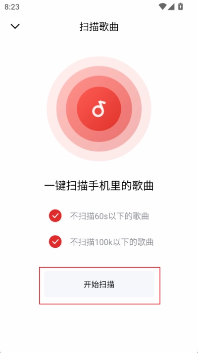 4、点击后会进入扫描歌曲的界面,在此界面能够一键扫描手机中的歌曲。只需点击下方的【开始扫描】按钮,待扫描完成,最后把扫描出的歌曲导入进来就行。