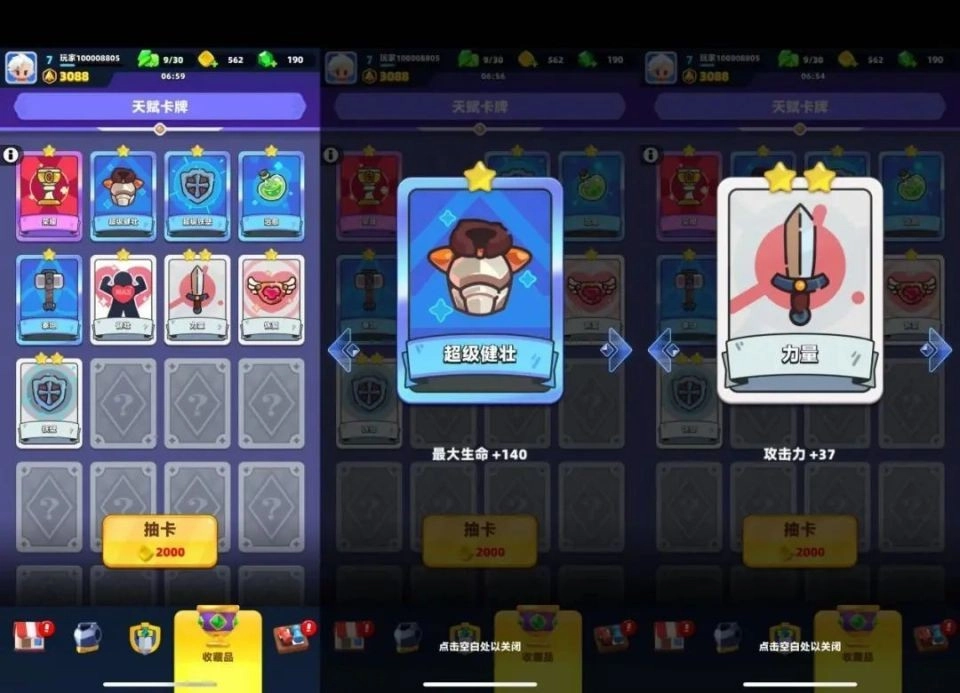 天赋方面,消耗金币抽取天赋卡牌即可获得各种加成。相同的卡牌可以二合一升级,获得更好的加成效果。