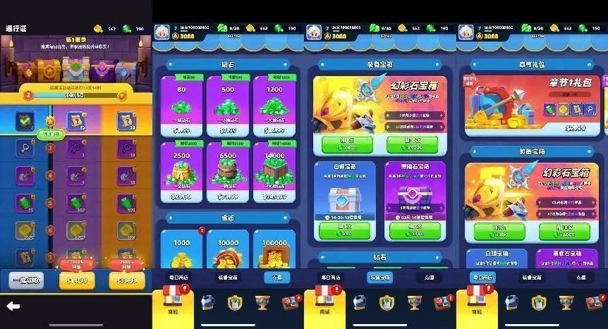 在变现形式上,当前版本采用混合变现模式。其中内购项目涵盖钻石直购、通行证以及各类礼包等。而激励视频提供的是免费钻石奖励,还有关卡内复活等功能。