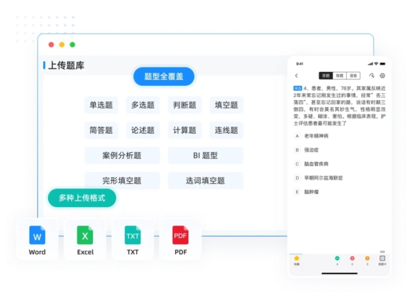 支持 Word、Excel、TXT、PDF 等多种格式的试题文档