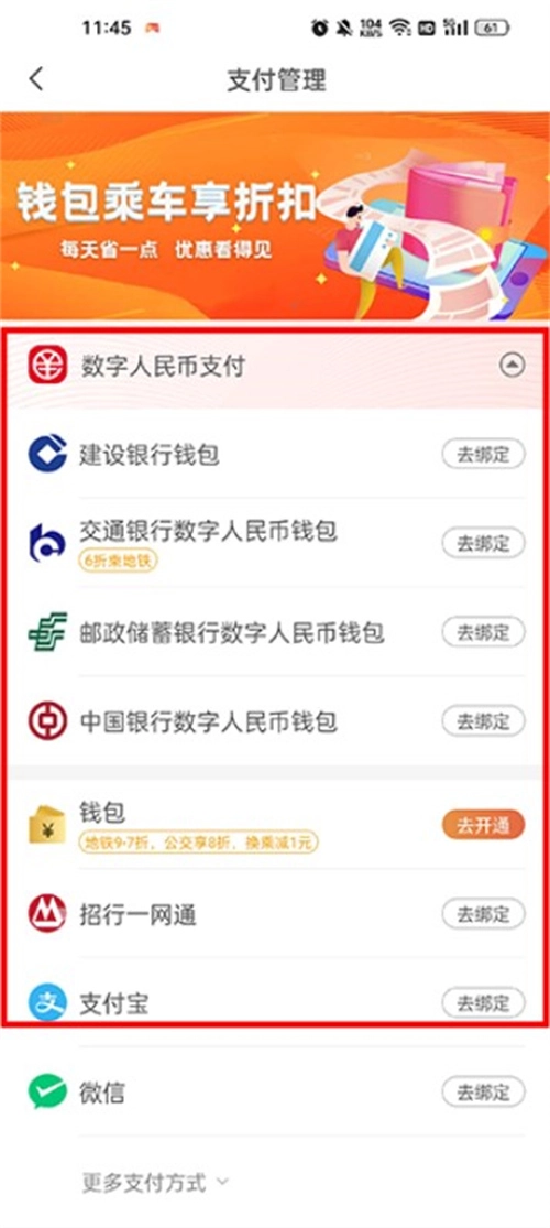4、挑选一种支付方式完成绑定,即可使用乘车码。