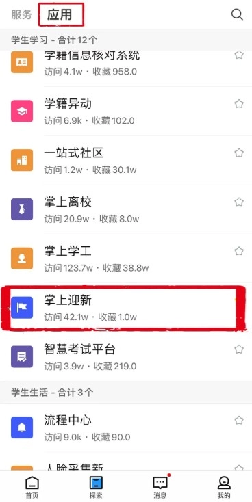 2. 进入后,在“探索 -> 应用”中找到[掌上迎新],点击进入查询录取详情,并及时完善报到信息。(具体迎新时间和操作方法请关注智慧工程的消息通知。)