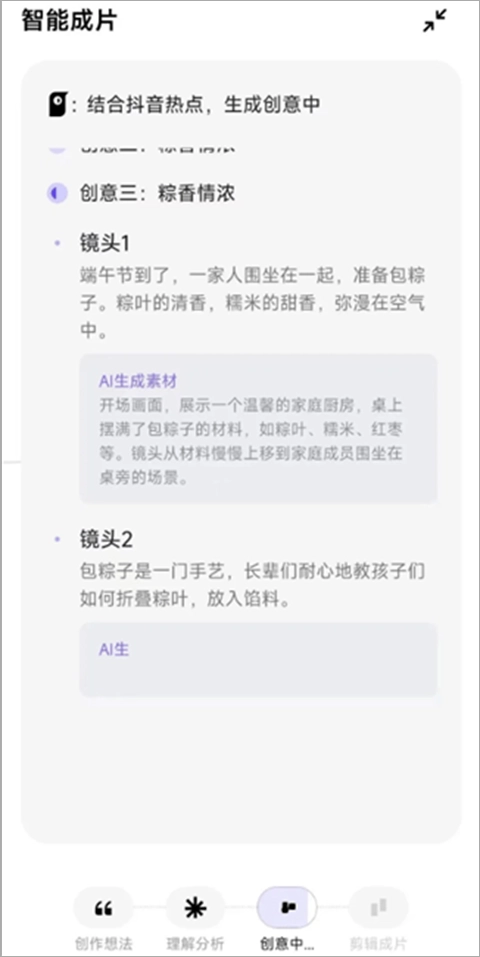 请选择“智能成片”选项,随后在弹出的对话框中输入你想要制作的内容,例如“端午节一家人包粽子” 。