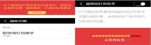 我们打开抢红包界面,点击上方的开启按钮,进入“辅助功能->超级抢红包助手”,接着点击开启。操作完成后返回主界面,若看到有进度条在运行,就表明设置成功了。
