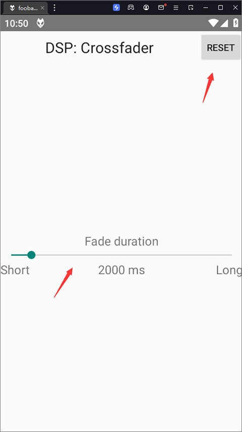 4、交叉渐变器(Crossfader),能够达成音乐淡入淡出的效果。拖动箭头所指滑块,向右滑动可增加时间,向左滑动则减少时间,时间单位为毫秒。若对此设置不满意,可点击右上方位置进行重置。