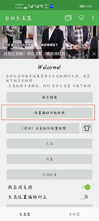 1、在手机上打开自动连点器,点击“设置辅助功能权限”,于设置里开启“自动连点器”的模拟点击功能。