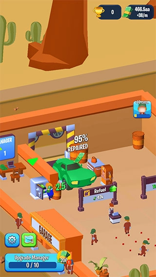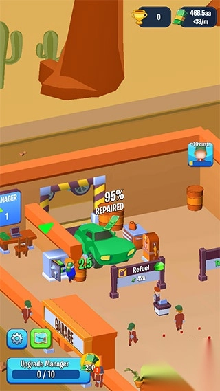 1、初始阶段从一个基础车库起步,逐步开设洗车、加油等服务,通过积攒资金进行设施扩建与设备升级。