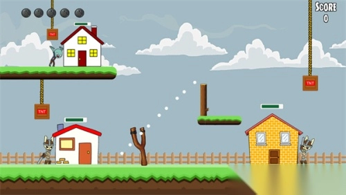 2、操控弹弓,瞄准右侧悬挂的红色方块。通过拖动屏幕来调整射击角度,借助抛物线原理绕过房屋障碍,精确击中目标以获取分数。