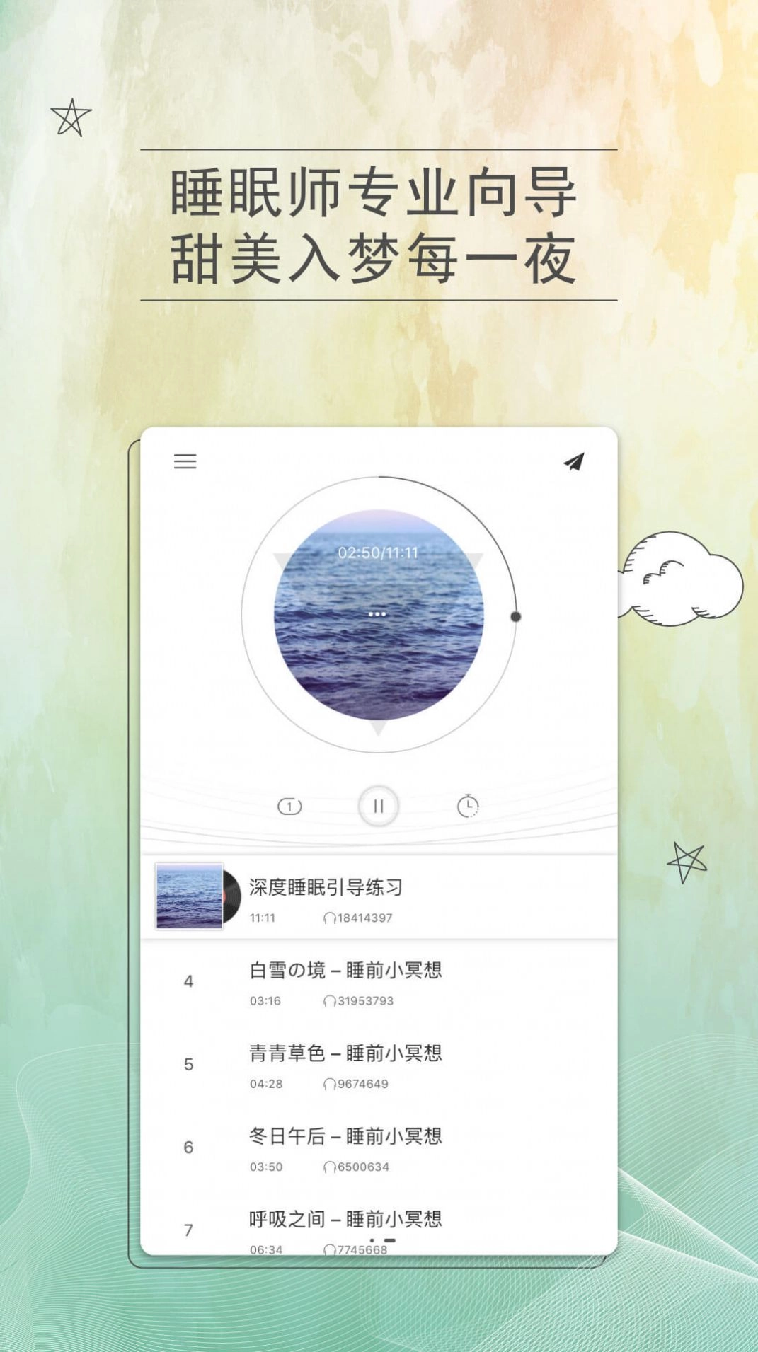 【1】专业疗愈催眠曲:春风细雨、摇篮小曲…认真采集只因音乐是解药,加入在身心放松及深度睡眠上皆卓有成效的脑波音乐。
