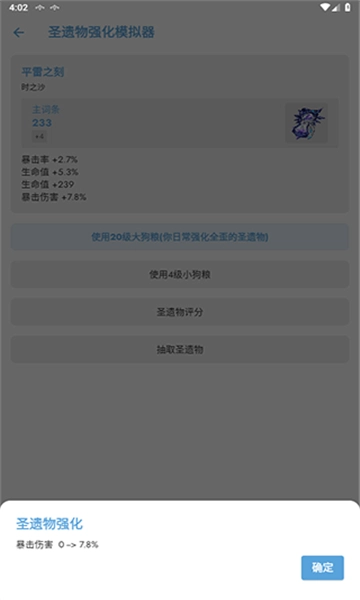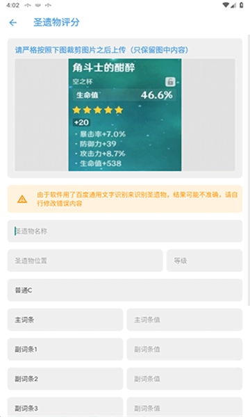 3、若你对游戏攻略感兴趣,可选择圣遗物评分。在此功能中,输入圣遗物名称,就能获取详细介绍,系统还会依据其属性给出评分。