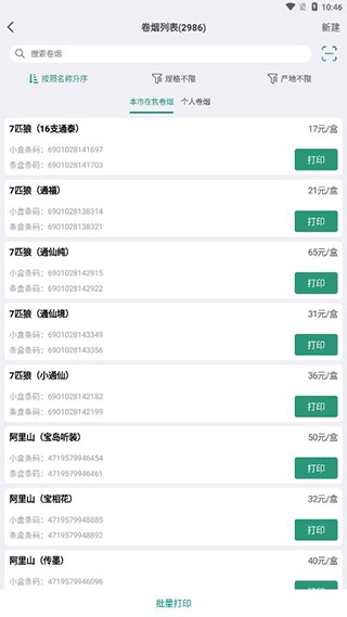 烟草价签管理,是一款专注于烟草价格打印的专业软件。它为商家精心打造了专业的商品管理及价签打印方案,带来方便、快捷且省时省力的优质服务。考虑到部分商家可能无法全面掌握烟草价格,软件特别设置了卷烟列表功能。这个列表十分全面,涵盖了2986种卷烟的价格信息,同时,条码、盒数、规格、产地、焦油量以及全市统一零售价等详细内容,都能在此便捷查看。不仅如此,借助卷烟搜索功能,商家只需输入卷烟名称,就能迅速获取该类型卷烟的价格。