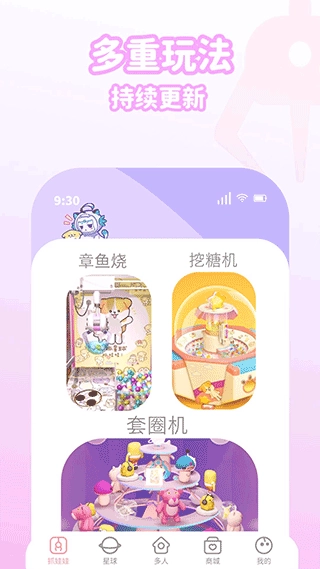 •【丰富玩法】:体验过能挂机抓娃娃的乐趣吗?这里汇聚了套圈机、挖糖机、无挡板机、一爪机、篮球机、升降挡板、剪刀机、章鱼烧、堆叠机等多样玩法,成功抓到娃娃后还有机会抽取大奖!